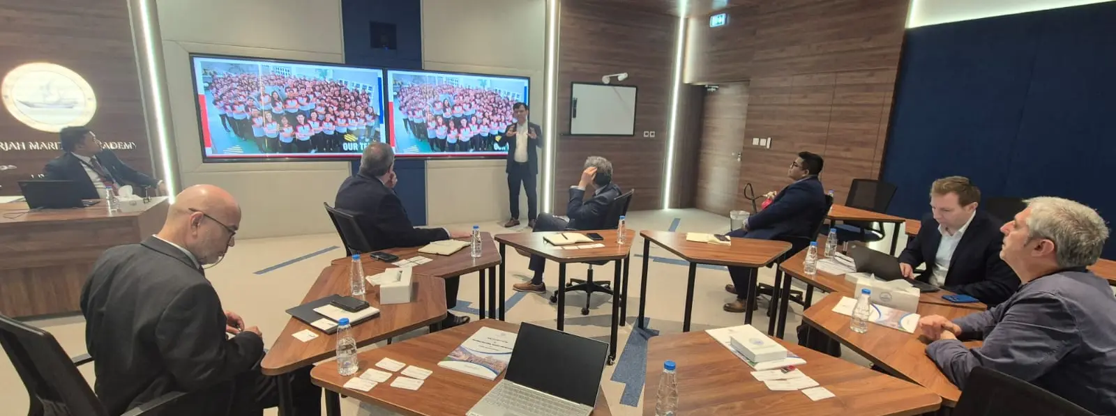 Upon their arrival on 26 February, the delegation was warmly received by Cadet Training Manager Dan Tolentino and Cadet Training Officer Joe Jurado—proudly former Marlow cadets in the Philippines. In the meeting room, they were joined by key figures in SMA’s leadership: Prof. Syamantak Bhattacharya (Provost & Vice-Chancellor, Academic), Mr. Giuseppe Saieva (Director of Training & Commercial Development), and Capt. Nadeem. Shortly after, the discussion was further enriched by the presence of Dr. Hashim Alzaabi, the Chancellor of SMA.